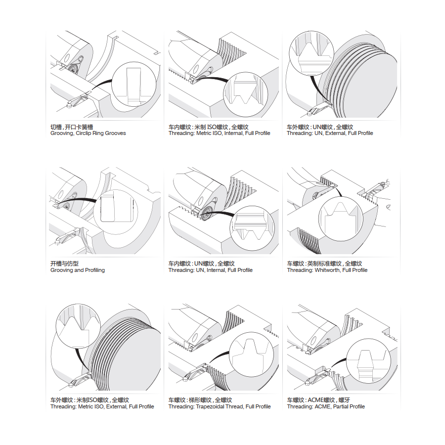 | 全半徑切槽與仿形 | 圓弧底槽,R 從 0.25 mm 起 |