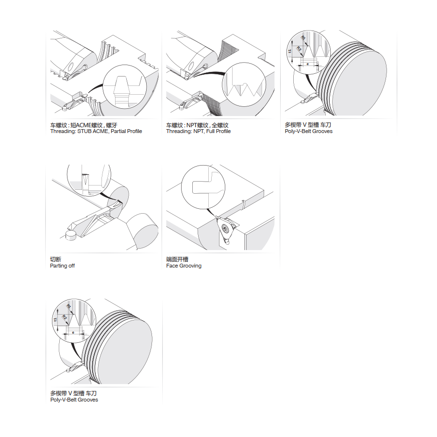 | 切斷 | 多種角度(5°–12°),寬度 1.0–2.0 mm,可選斷屑槽 |