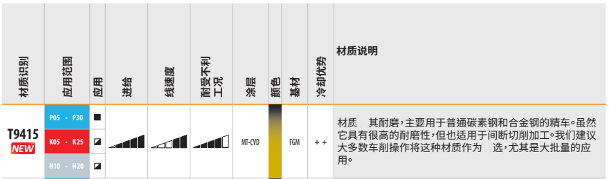 T9415材質(zhì)具有高耐磨性,MT-CVD涂層功能梯度WC-Co碳化物基體 ,適用于普通碳素鋼和合金鋼的精車。該材質(zhì)在保持良好耐磨性的同時(shí),也能適應(yīng)間斷切削加工。對(duì)于多數(shù)車削操作,尤其是批量加工,該材質(zhì)是一個(gè)適用選擇。